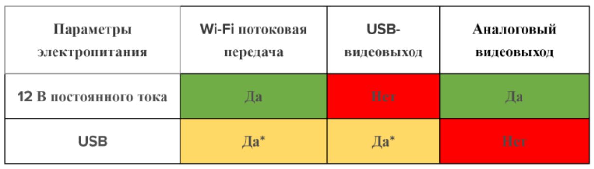 Пользователь может захотеть использовать питание от USB в качестве удобного варианта, если батарея постоянного тока 12 В недоступна. При использовании USB в качестве источника питания аналоговый видеовыход будет недоступен.