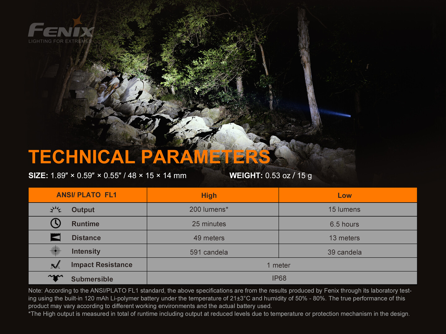 Размеры Fenix E02R составляют 48*15*14 миллиметров. Вес равен 15 граммам. Выдерживает падения с высоты одного метра. Стандарт защиты от воды и пыли – IP68.