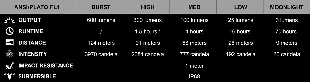 | Яркость | 600 люмен | 300 люмен | 100 люмен | 25 люмен | 3 люмен | ||
