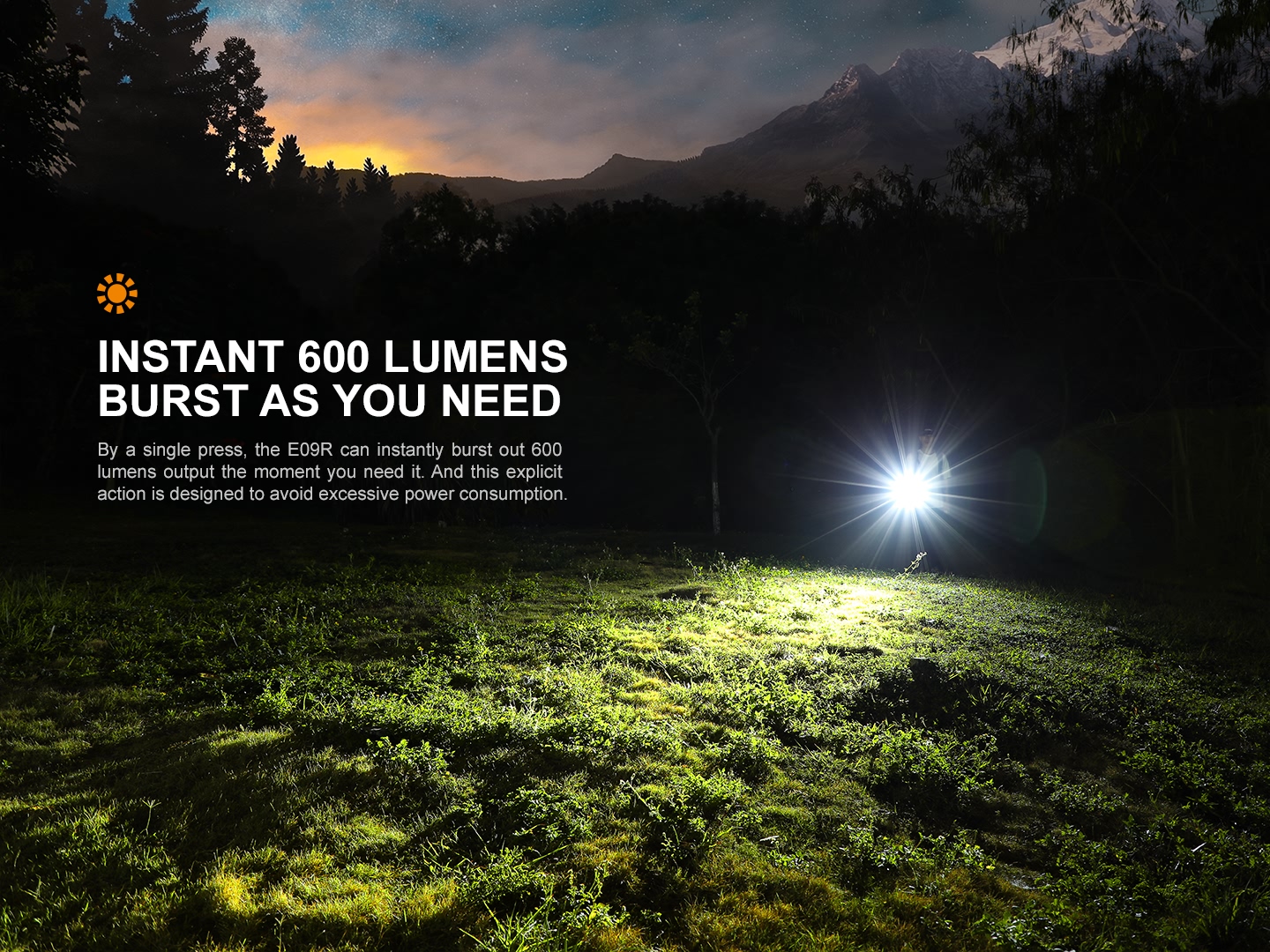 Модель Fenix E09R представляет собой небольшой по размерам и лёгкий брелок, который обеспечивает освещение яркостью до 600 люменов. При этом дальнобойность луча составляет 124 метра. Функционирует модель на светодиоде Luminus SST20, а элементом питания является встроенный Li-Po аккумулятор 800 мАч. Срок службы такого светодиода достигает 50 тысяч часов.