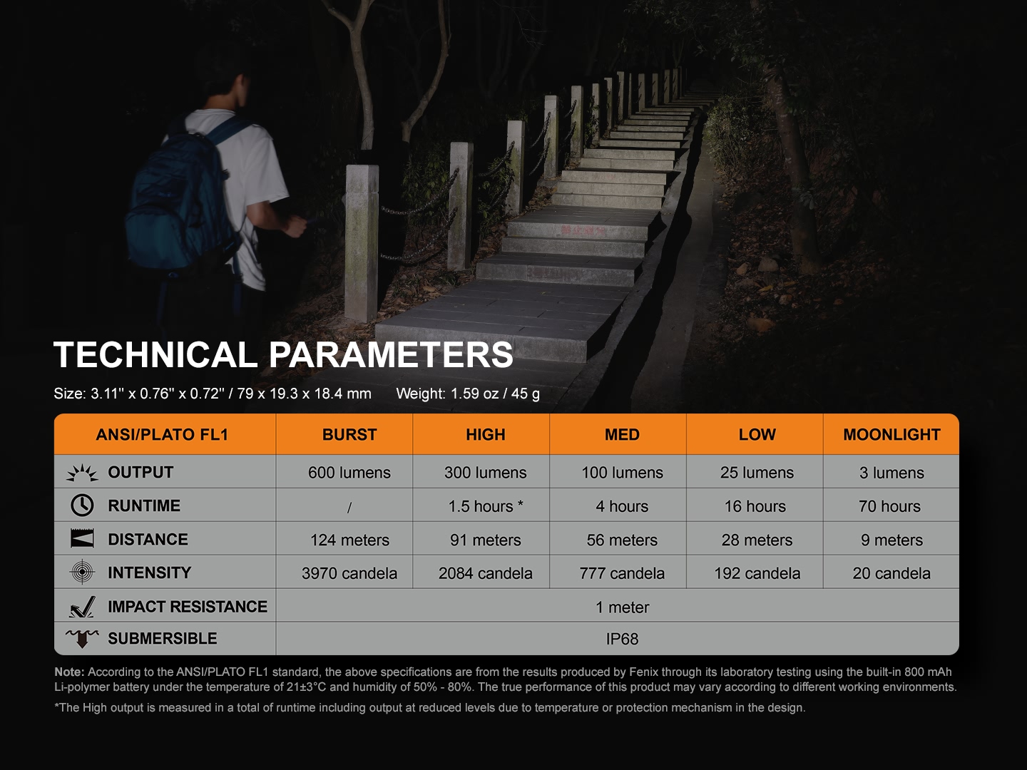 Корпус фонаря сделан из прочного и надёжного алюминия A6061-T6. Поверхность обработана премиальным жёстким анодированием, стойким к абразивным воздействиям. Стандарт защиты от пыли и влаги: IP68. Модель легко переносит падение с высоты до одного метра. Размеры составляют 79*19,3*18,4 мм. Весит фонарь 45 грамм.