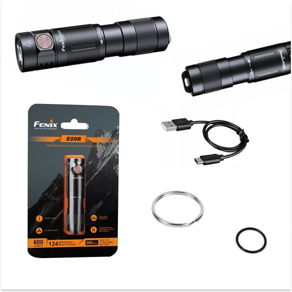 Модель Fenix E09R представляет собой небольшой по размерам и лёгкий брелок, который обеспечивает освещение яркостью до 600 люменов. При этом дальнобойность луча составляет 124 метра. Функционирует модель на светодиоде Luminus SST20, а элементом питания является встроенный Li-Po аккумулятор 800 мАч. Срок службы такого светодиода достигает 50 тысяч часов.