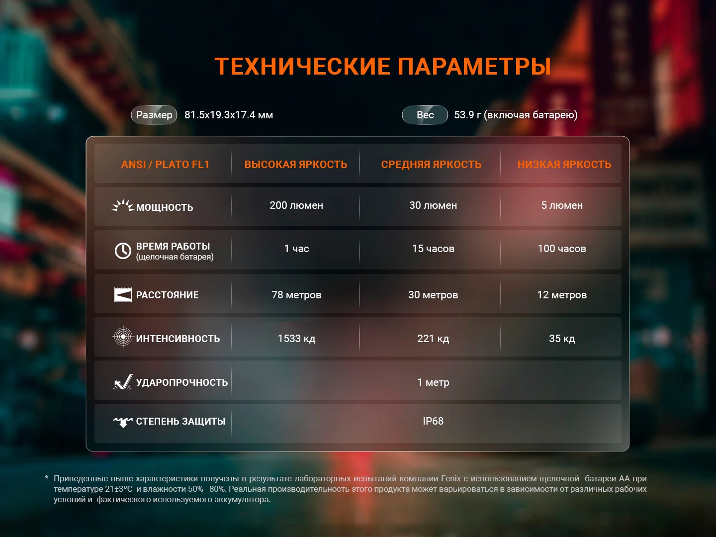 - High (высокий) — 200 люмен — 78 метров — 1 час — 1533 кандел;