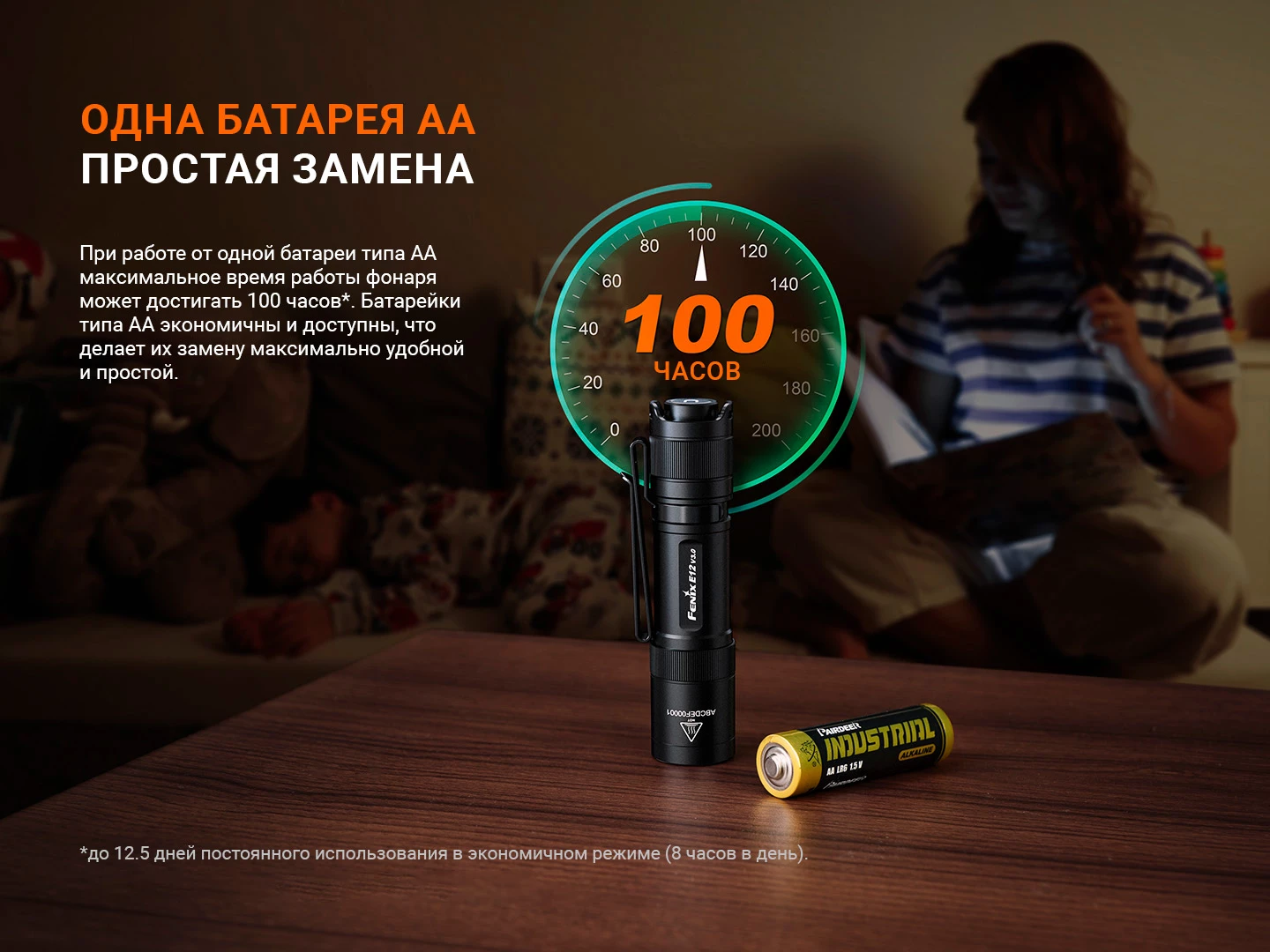 Модель Fenix E12 V3.0 оснащена светодиодом Luminus SST20 со сроком службы 50 000 часов.
