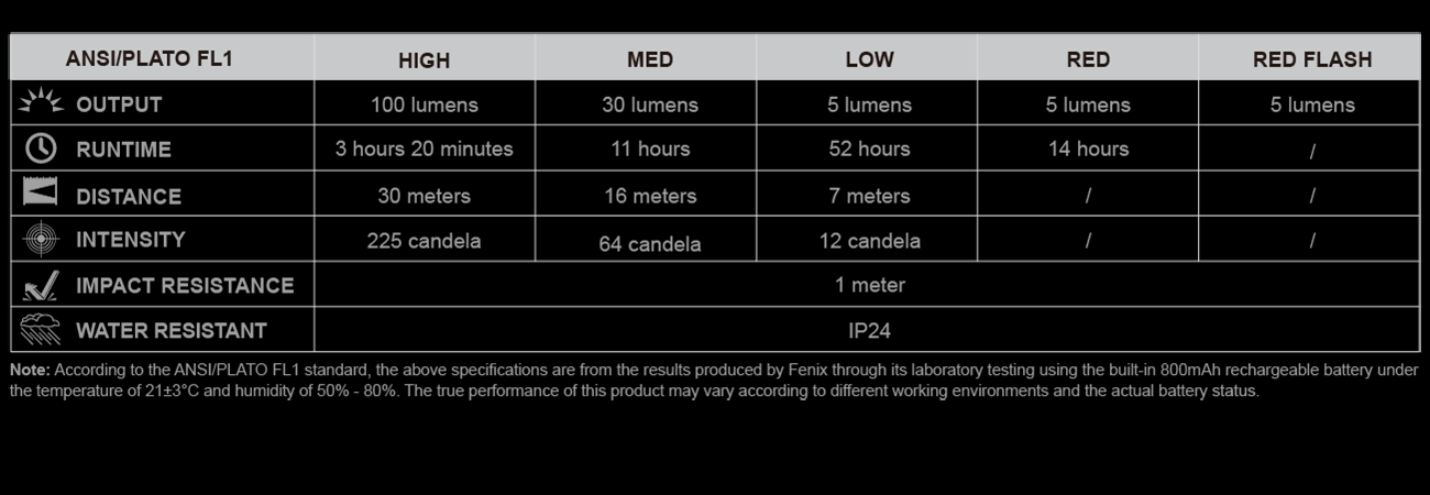 Примечание: в соответствии со стандартами ANSI/PLATO FL1, указанные выше параметры работы фонаря основаны на результатах, полученных фирмой Fenix в ходе лабораторных опытов. Испытания провели с применением встроенного 800mah аккумулятора при температуре 21±3°C и влажности 50%-80%. Реальные показатели этого продукта могут отличаться в зависимости от различных условий окружающей среды и задействованнного аккумулятора.