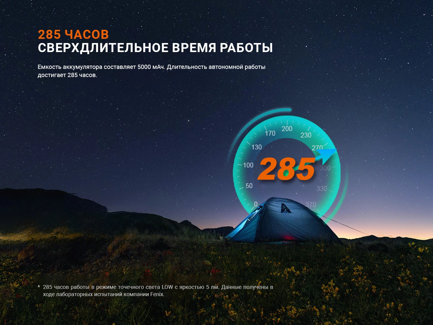 Аккумулятор емкостью 5000 мАч обеспечивает до 285 часов непрерывной работы. Кроме того, фонарь способен работать от двух разных источников питания, что увеличивает его универсальность. Аккумулятор ARB-L21-5000 V2.0 идет в комплекте.