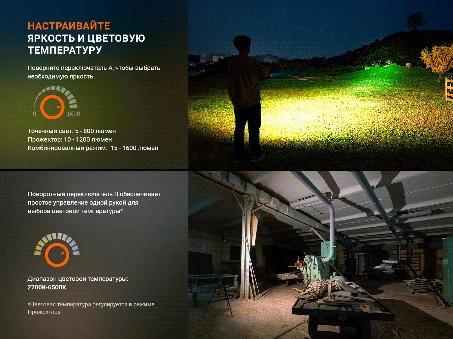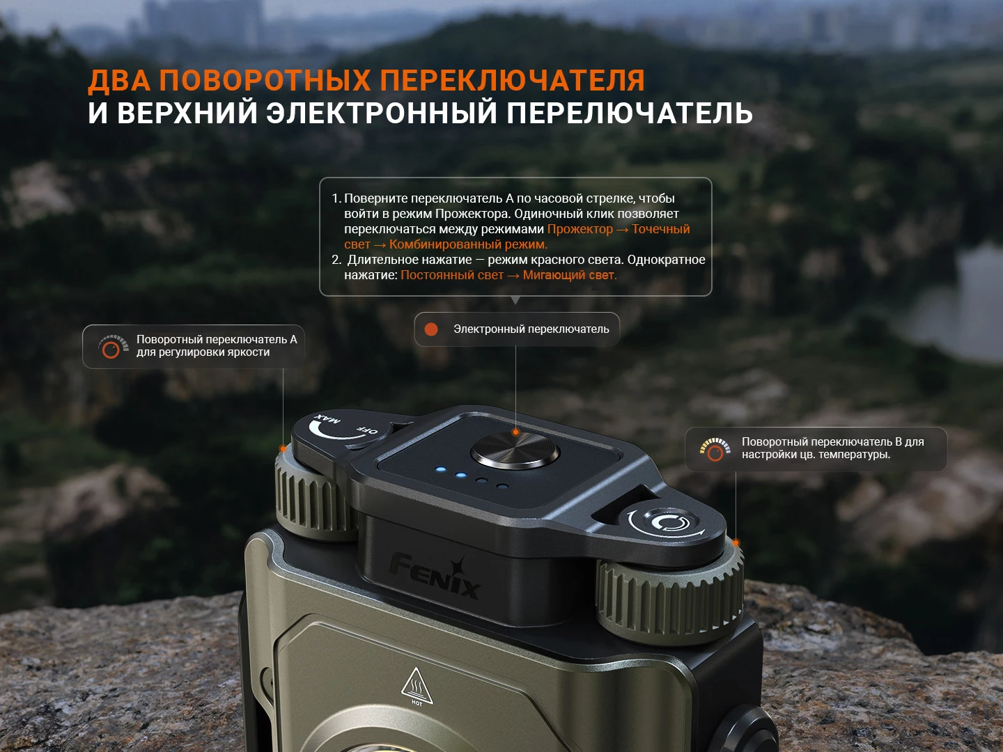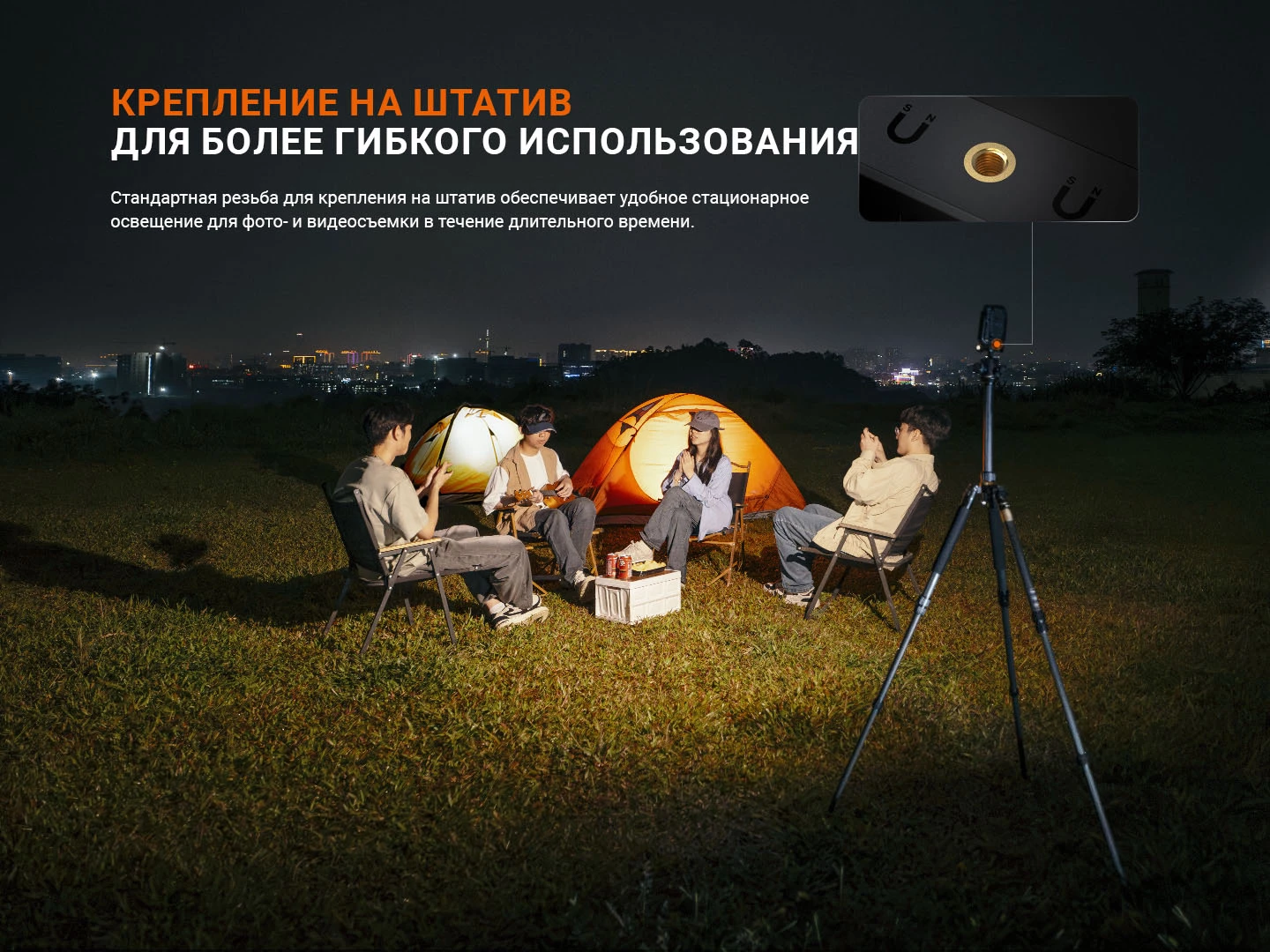 Фонарь Fenix CL27R оснащен двумя поворотными переключателями, которые позволяют плавно регулировать яркость и цветовую температуру света. Переключатель прокручивается на 360°, обеспечивая круговое освещение. Магнитное основание рукоятки позволяет установить фонарь на металлической поверхности и работать без рук, что особенно удобно в полевых условиях. Резьбовое гнездо для штатива размножает вариации размещения фонаря.
