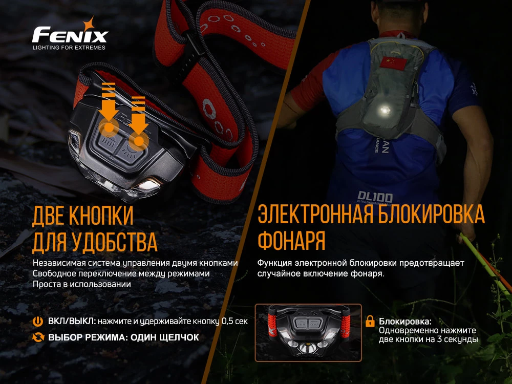 Налобный фонарь Fenix HL18R-T управляется при помощи двух переключателей. Кнопка дальнего освещения необходима для включения и выключения фонаря, а также для переключения между различными режимами освещения. Она нужна ещё и для блокировки прибора и активации режима дальнего света. Кнопка ближнего освещения служит для включения и выключения налобника, чтобы переключаться между режимами, а также для блокировки и активации режима ближнего света.