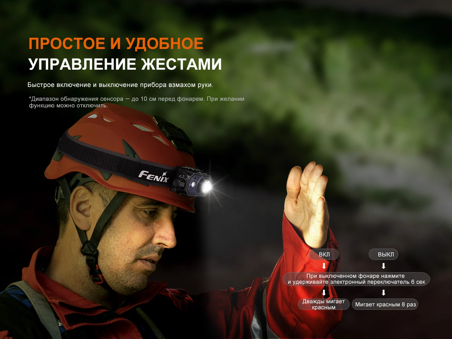 Для максимального удобства использования предусмотрена функция управления жестами. Она незаменима, если нужно быстро включить или выключить фонарь, а руки заняты или испачканы. Диапазон срабатывания находится на расстоянии до 10 см. Режим управления жестами можно выключить, если он не нужна, — для этого необходимо удерживать электронный переключатель в течение 6 секунд при выключенном свете. Также фонарь обладает функцией понижения яркости при приближении к освещаемому объекту.
