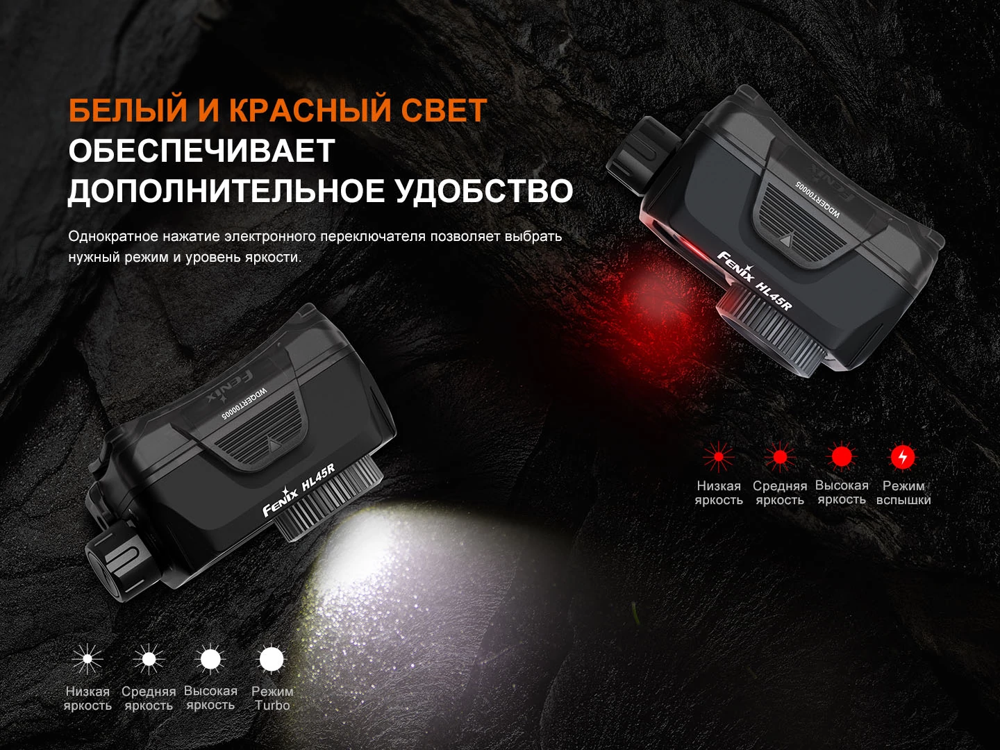 Боковой поворотный тумблер позволяет легко переключаться между режимами белого и красного света. Для выбора яркости освещения в верхней части фонаря есть электронная кнопка — однократное нажатие последовательно меняет яркость с низкой до максимальной. С помощью фокусировочного кольца можно без труда настраивать точечный свет или режим прожектора.