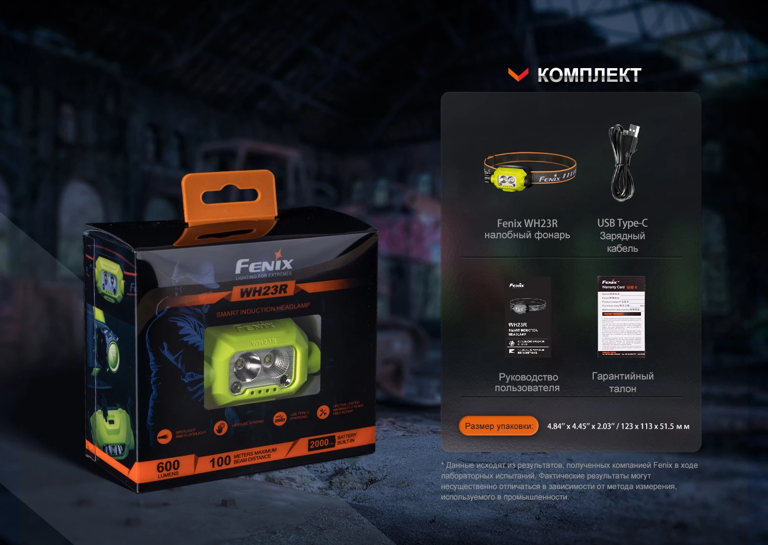 Комплектация: модель фонаря Fenix WH23R, зарядный кабель USB Type-C, инструкция, талон гарантии.