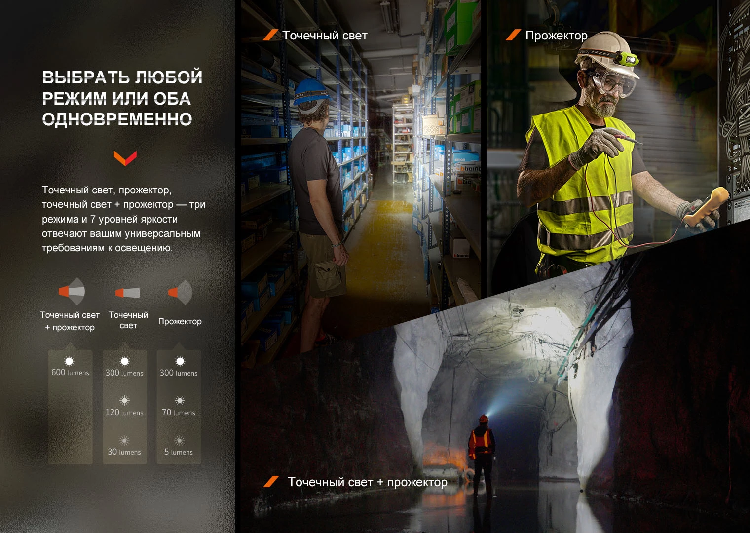 Ближний + Дальний, Turbo. Световой поток составляет 600 люменов, длительность работы – 3 часа и 49 минут. Дальнобойность луча – 100 метров, интенсивность освещения – 2280 кандел.