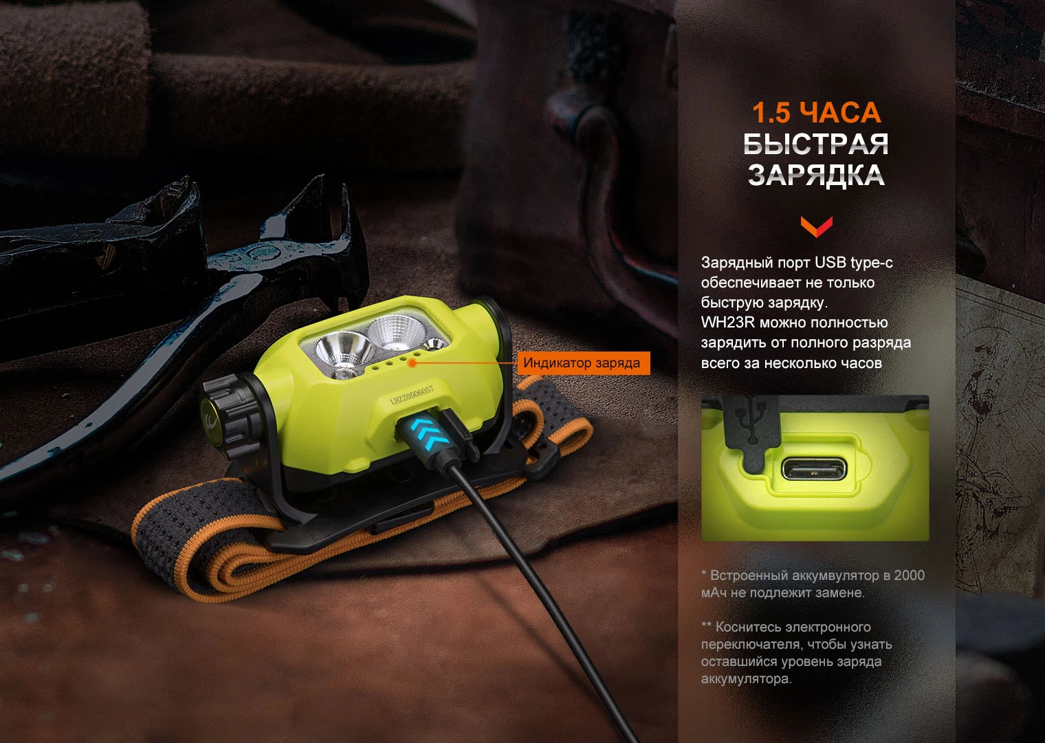 Универсальный фонарь WH23R даёт наибольший световой поток 600 люменов с расстоянием действия луча 100 метров. Комбинированную поворотную кнопку можно быстро и точно применять даже в перчатках или с замерзшими пальцами, чтобы установить желаемый режим и яркость. Дополнительные особенности дизайна WH23R включают встроенную батарею ёмкостью 2000 мАч, порт зарядки USB Type-C, четыре синих светодиодных индикатора, демонстрирующих оставшийся заряд батареи, и перфорированную структуру оголовья, обеспечивающую лучшую воздухопроницаемость и удобство.