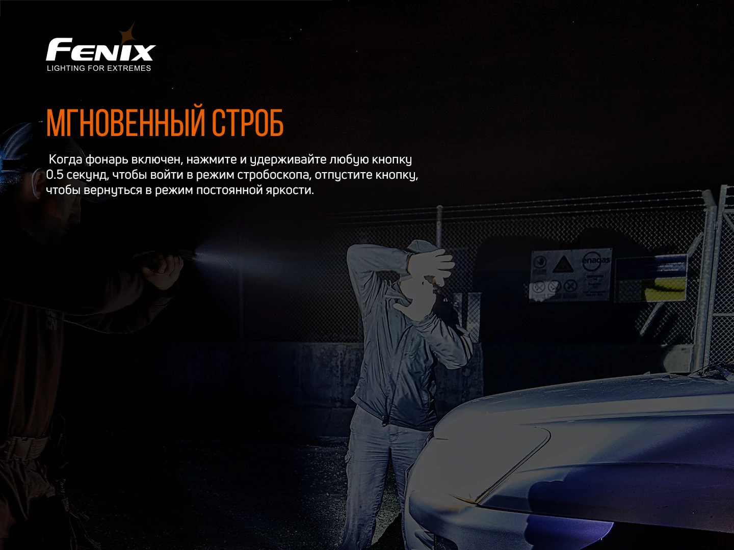 Запуск мгновенного режима строба: из включённого состояния нажмите и подержите любой переключатель половину секунды, чтобы запустить режим стробоскопа. Чтобы возвратиться к стандартному освещению, отпустите кнопку. Важно: использование света в режиме стробоскопа вызывает судороги у людей, которые склонны к фоточувствительной эпилепсии. Для того, чтобы заблокировать модель: из выключенного состояния одновременно нажмите и подержите две кнопки в течение пяти секунд. Модель дважды мигнёт, чтобы подтвердить то, что она заблокирована. Если нужно будет разблокировать, нажмите и подержите обе кнопки в течение секунды. После этого вы сможете включить модель. Она запустится в том режиме, который применялся до момента выключения.