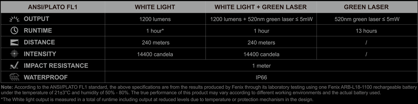 Тактический фонарь Fenix GL23R работает в 3 режимах.- Белый свет — 1200 люмен — 240 метров — 1 час — 14400 кандел;