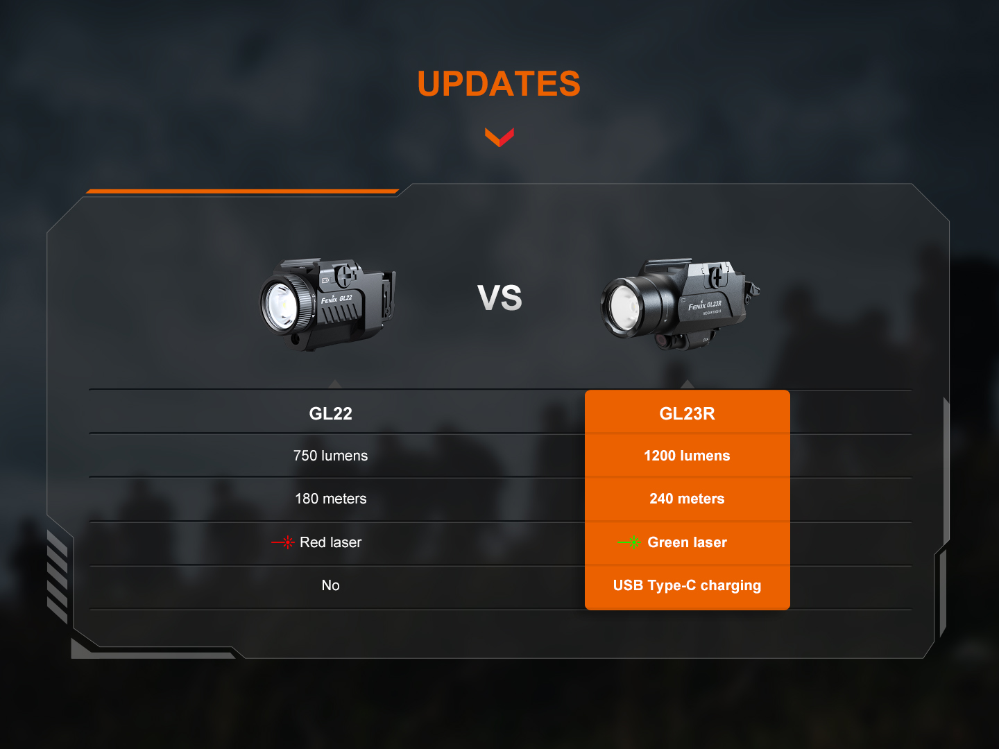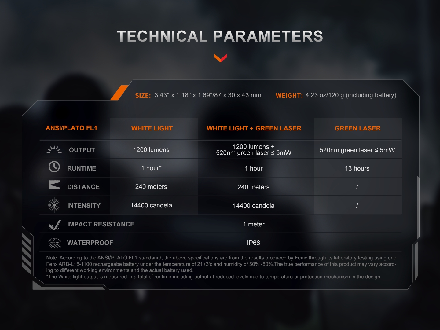 Благодаря мощному светодиоду Fenix GL23R обеспечивает яркость в 1200 люмен. Интенсивный свет поможет определять цели на расстоянии, поскольку дальнобойность луча составляет 240 м. Светодиод и линза TIR фокусируют свет в гибридный луч с большим центральным пятном и широким рассеянным освещением, что является эффективной комбинацией для боя на дальней и близкой дистанции.