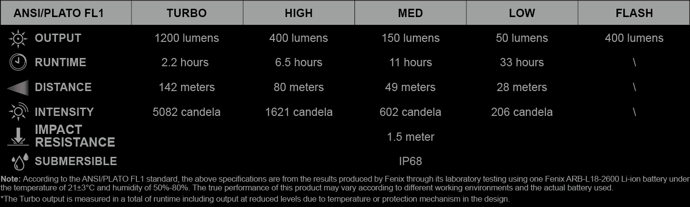 Эти параметры работы модели получены в результате проведения лабораторных опытов. Где был использован аккумулятор литий-ионный Fenix ARB-L18-2600 при температуре 21 +- 3 градуса Цельсия и влажности воздуха 50%-80%. При иных условиях внешней среды, а также в зависимости от элемента питания, реальные показатели свечения могут быть иными.