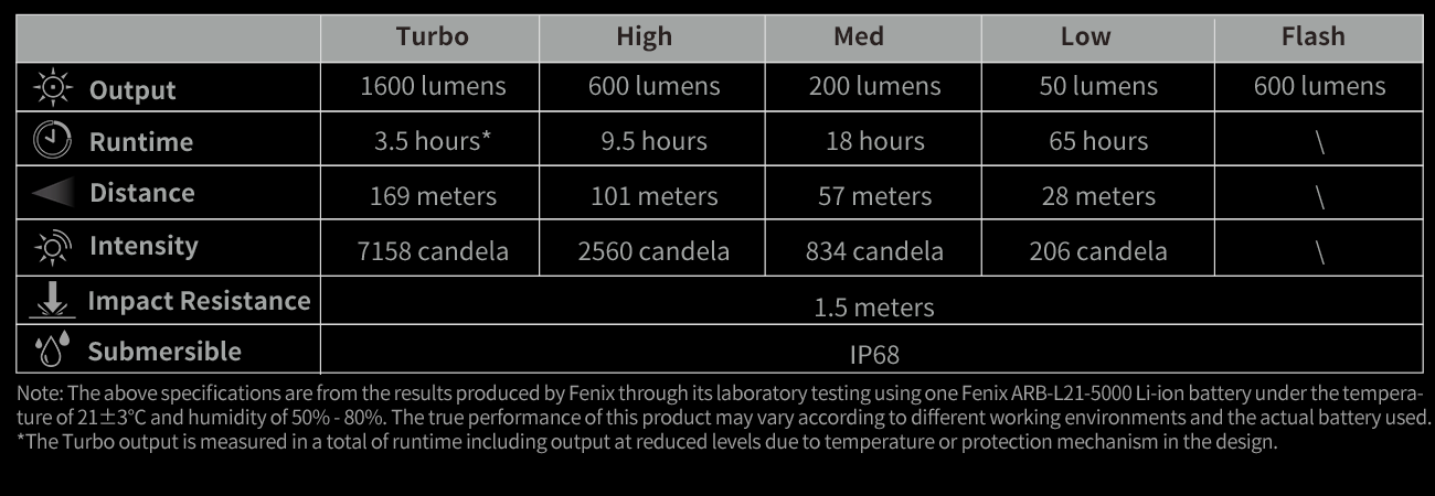 * Примечание: параметры работы, которые указаны выше, были получены при проведении лабораторных испытаний. Где были следующие условия: использовался литий-ионный аккумулятор 21700 Fenix ARB-L21-5000, температура достигала 21 +-3 градуса Цельсия, а влажность воздуха была порядка 50%-80%. Реальные показатели свечения фонаря могут быть иными в зависимости от условий внешней среды и применяемого аккумулятора.