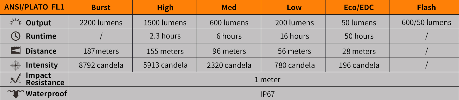 - Режим Burst. На этом уровне фонарь выдаёт наибольшую яркость освещения, которая заявлена производителем, 2200 люмен. При этом световой поток преодолевает расстояние в 187 метров.