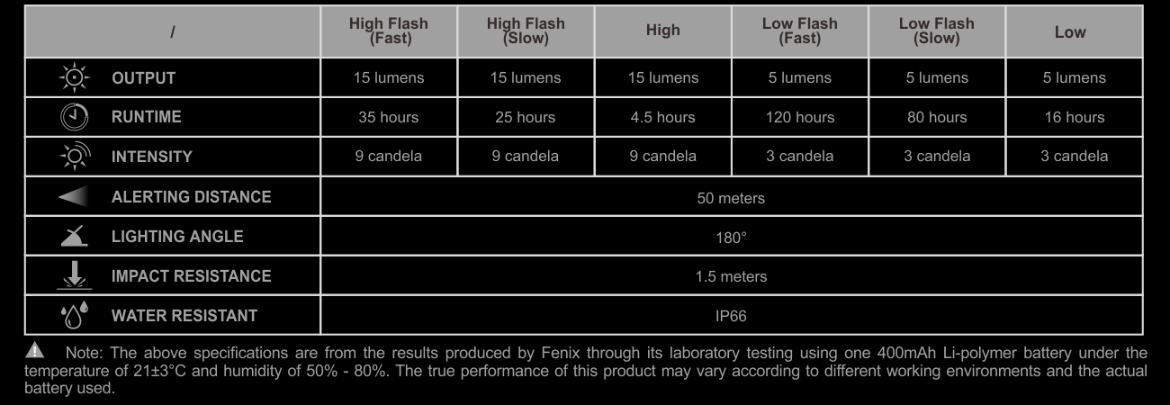 Фонарь является источником света большой яркости, поэтому нельзя направлять его в глаза человеку либо животным, во избежание травмы. Светодиоды в этой модели не подлежат замене, поэтому по окончании срока действия диодов нужно покупать новый фонарь. Если какая-то информация, представленная в инструкции, поменяется, новая версия будет иметь силу по сравнению со старой. Производитель Fenix не отправляет клиентам новую инструкцию в случае изменений в старом руководстве.