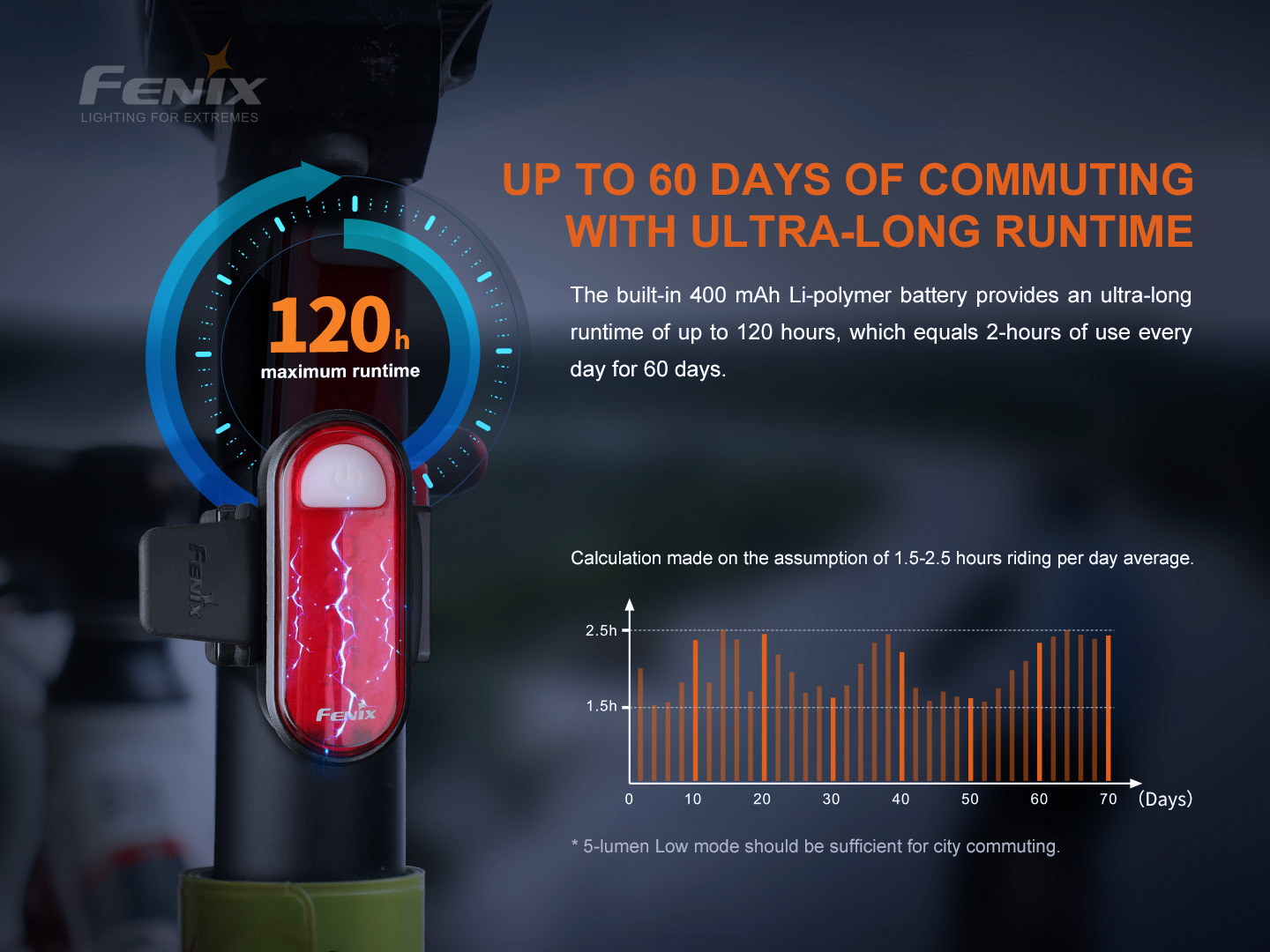 Фара Fenix BC05R V2.0 в состоянии быстро подзаряжаться при помощи интерфейса USB Type-C. Встроенный литий-полимерный аккумулятор ёмкостью 400 мАч обеспечивает время свечения до 120 часов. С имеющимся зажимом для тела универсальная задняя велофара может быть использована в качестве также нагрудного фонаря либо фонаря для рюкзака.