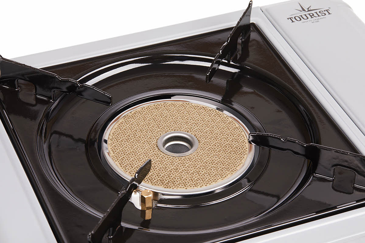 В некоторых моделях газовых обогревателей и плит марки «Tourist» используется уникальный микропористый керамический излучатель. К основным преимуществам керамики можно отнести более эффективную генерацию и распределение тепла за счет полного сгорания газовой смеси, отсутствие открытого пламени, что повышает безопасность прибора и препятствует задуванию пламени ветром во время работы, а также существенное снижение расхода газовой смеси.